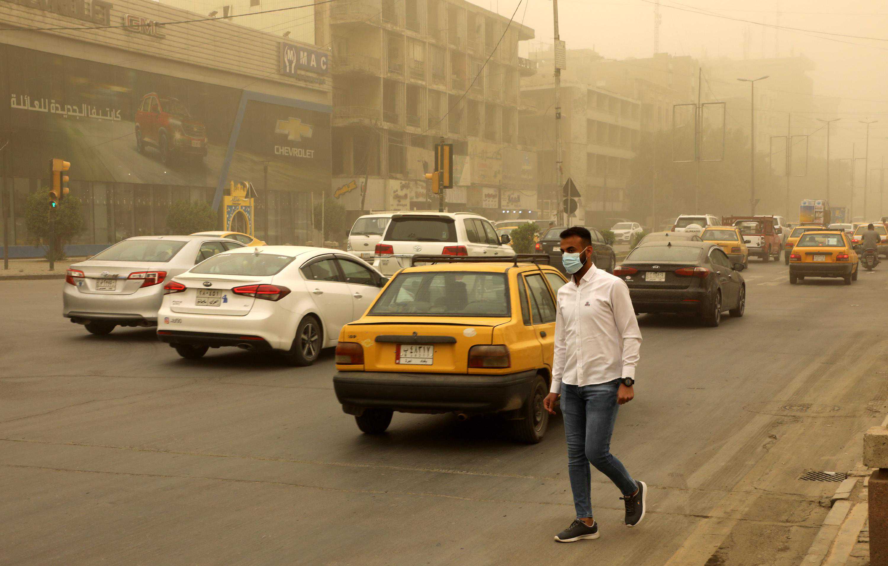 4月12日,在伊拉克首都巴格达,车辆在沙尘天气中出行。新华社/欧新