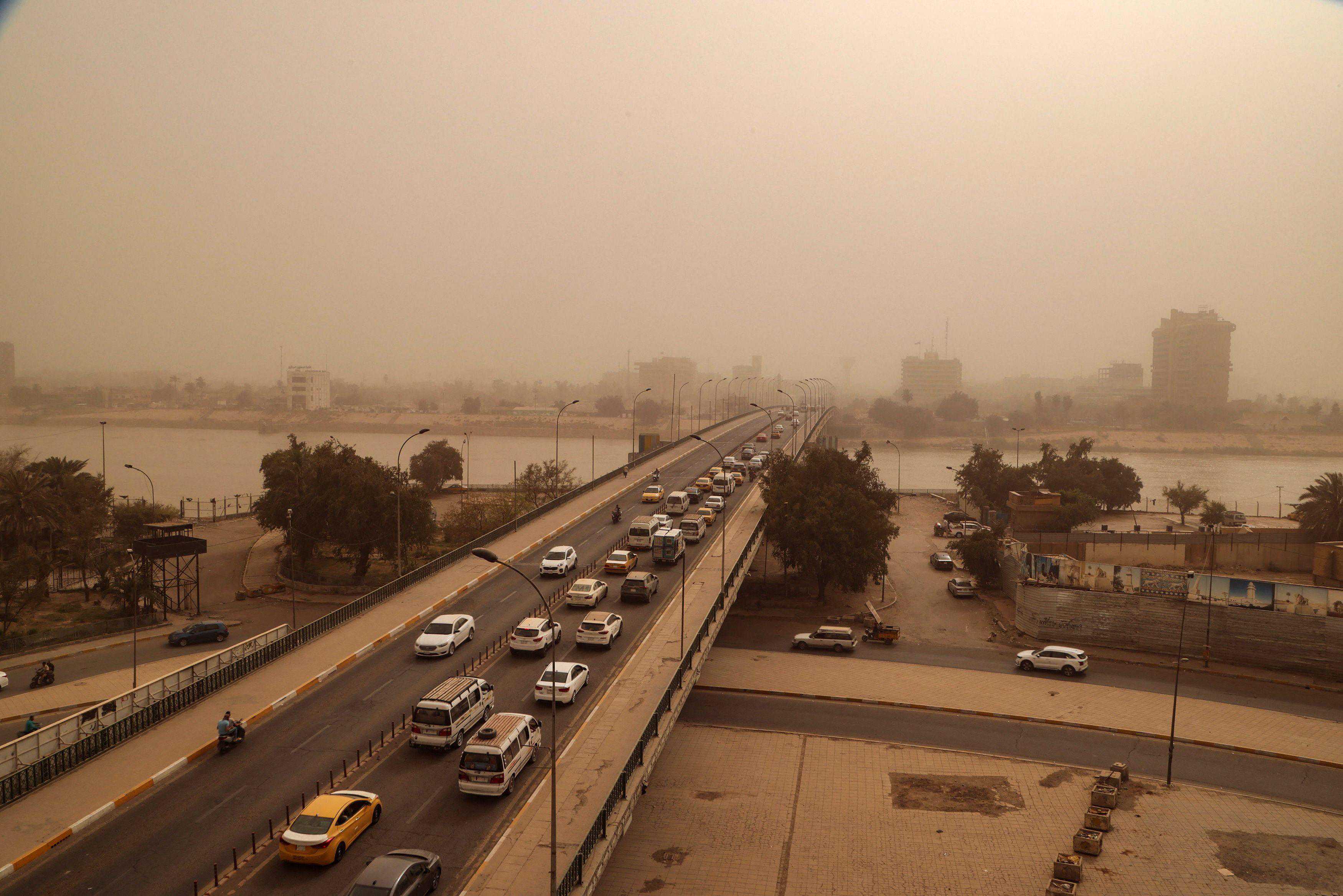4月12日,在伊拉克首都巴格达,车辆在沙尘天气中出行。新华社/路透