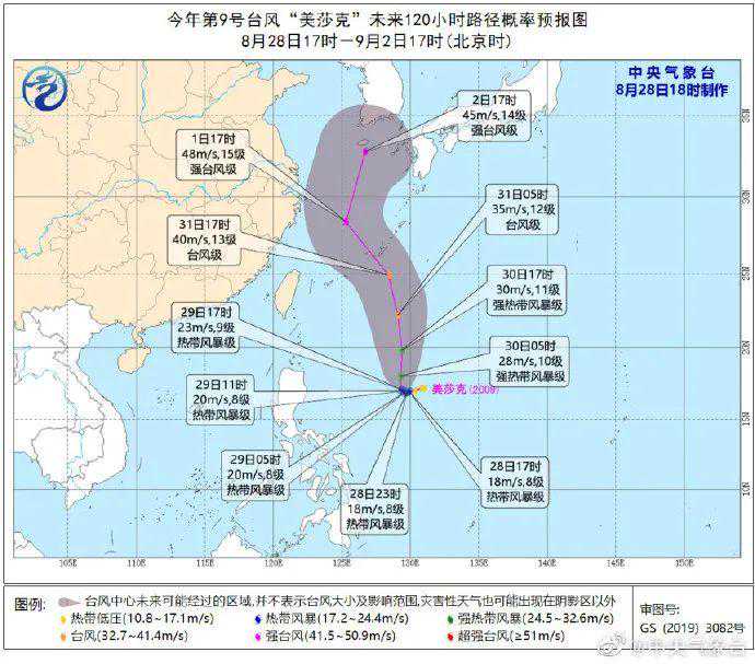 它的路径是怎么样的呢?据中央气象台:预计台风“美莎克”先在原地回旋,29日以后将以每小时15-20公里的速度向北偏西方向移动,将于31日夜间移入东海南部海面,强度逐渐加强;最强可达强台风级(45-50米/秒,14-15级);9月1日夜间开始,在东海北部转向北偏东方向移动,趋向朝鲜半岛南部,强度逐渐减弱。