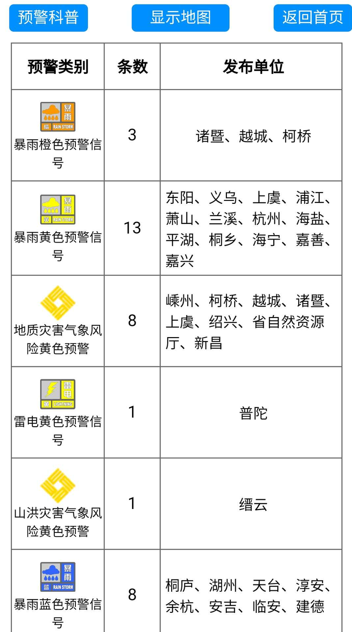 截至17:45,诸暨、越城、柯桥三地发布暴雨橙色预警,东阳、义乌、上虞等13地发布暴雨黄色预警,桐庐、湖州、天台等八地发布暴雨蓝色预警。