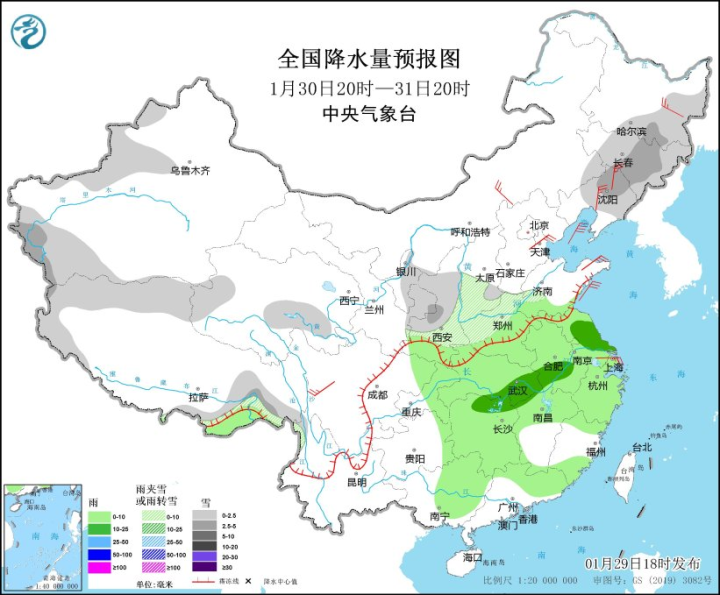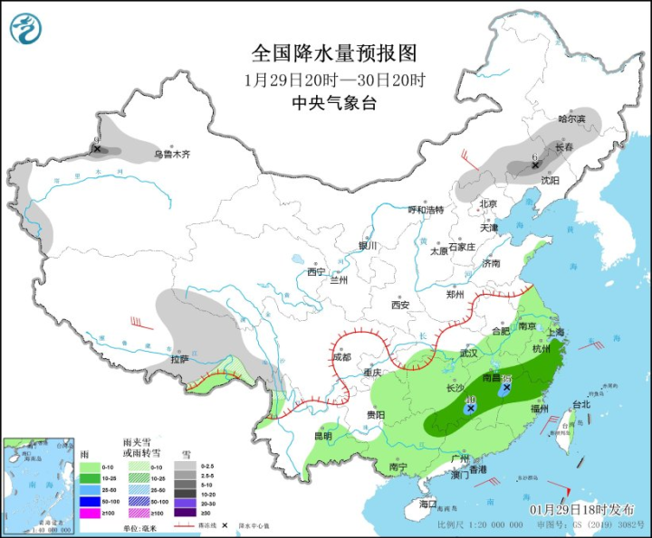 29日夜间至30日,江南中南部、华南北部等地有中到大雨;青藏高原东部和北部、东北地区中南部、内蒙古东南部等地有小到中雪或雨夹雪,局地有大雪。