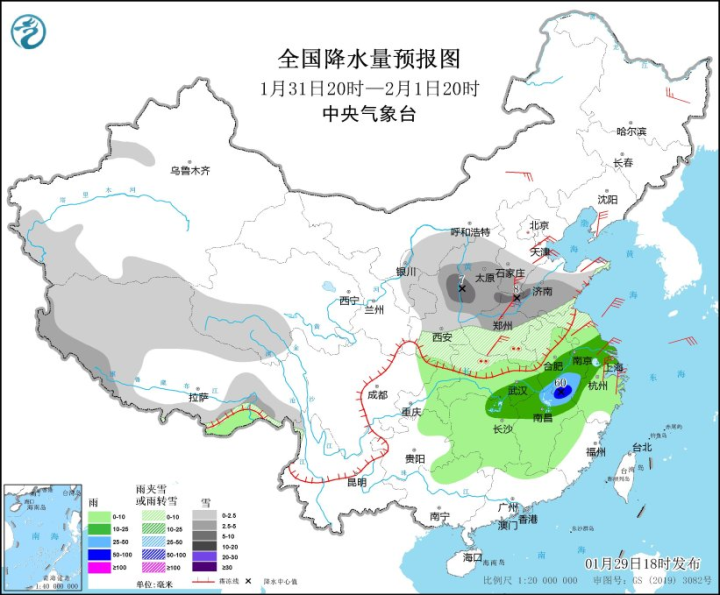 图3全国降水量预报图(1月31日20时-2月1日20时)