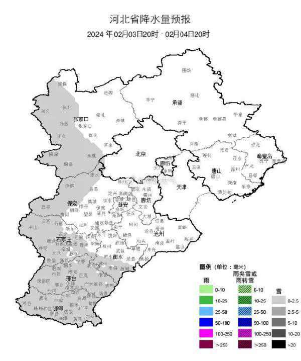 天气现象最高气温最低气温风力石家庄小雪0-4北风微风张家口小雪-2-9东南风3-5级承德阴0-12东风微风唐山多云转阴2-7东北风微风秦皇岛多云转小雪-1-8东风3-5级廊坊阴转小雪2-7东南风微风保定多云2-8东南风微风沧州小雪2-5东北风3-5级衡水小雪2-5东北风微风邢台中雪转小雪-1-8北风微风邯郸小雪0-7北风3-5级雄安新区多云3-8东南风微风定州小雪2-6东南风微风辛集小雪1-4北风微风北京阴转小雪2-6南风微风天津阴转小雪2-5东风微风中国气象局2024年2月3日18时发布