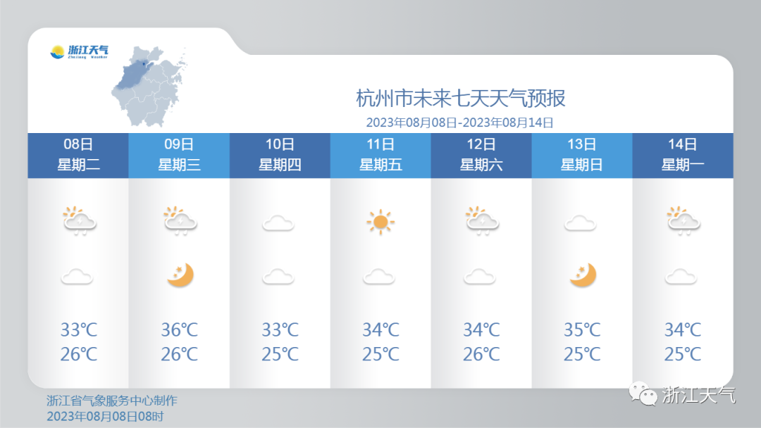 近期,浙江还是以午后分散性阵雨或雷雨天气为主,气温较为平稳,最高气温基本都在35℃以下,但是湿度较高,体感会有些闷热。