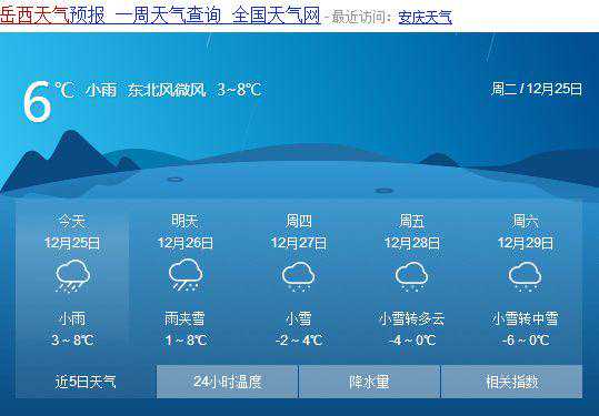 星期四(12月27日)小雨,山区小雨转雨夹雪或雪;