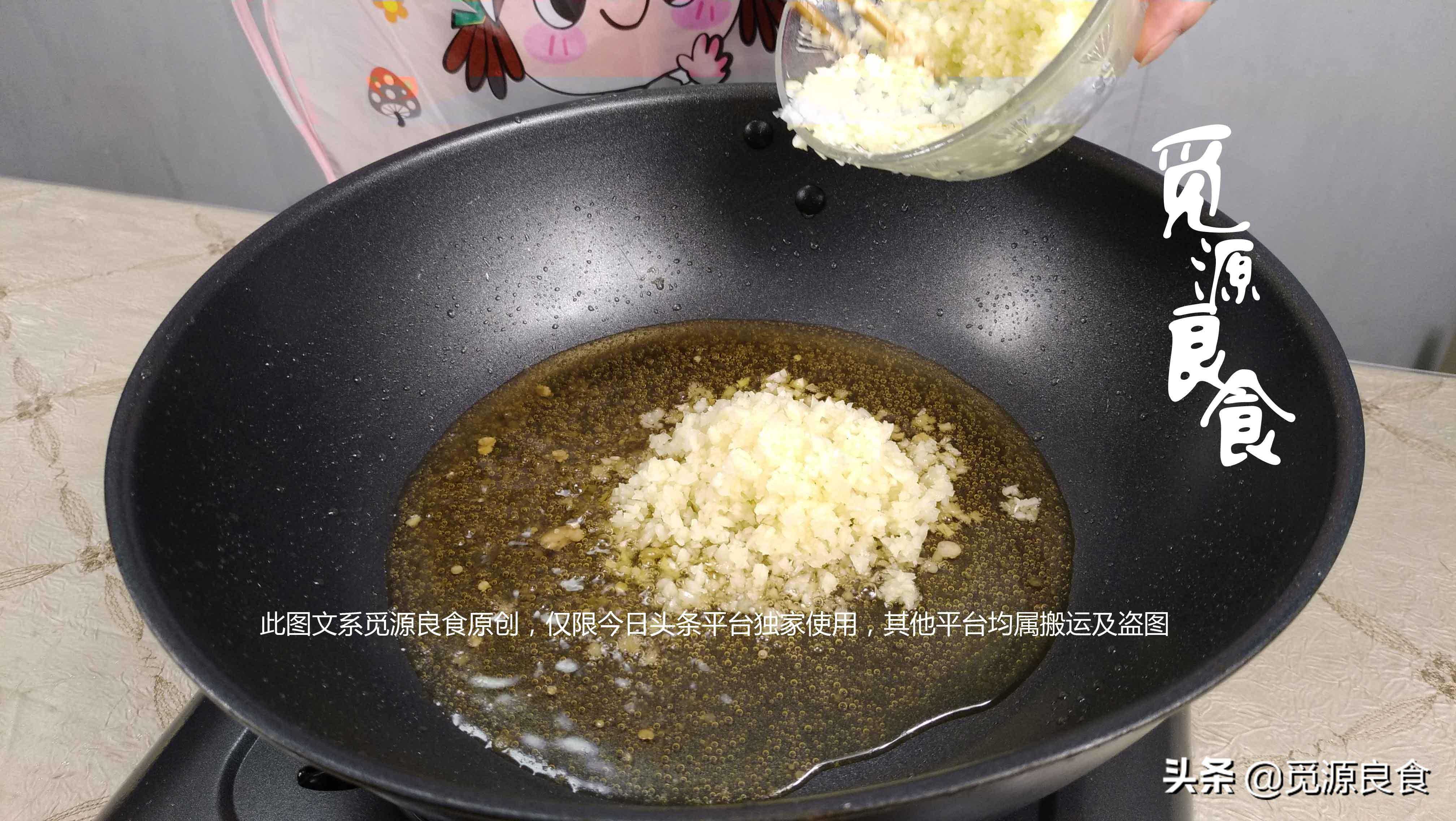6、炸过虾的油,其实很鲜的,所以我们也不浪费,直接往热油中放入刚刚准备好的蒜蓉,放入的分量大约是大半碗的样子,还需要留一点蒜蓉待会出锅时用;