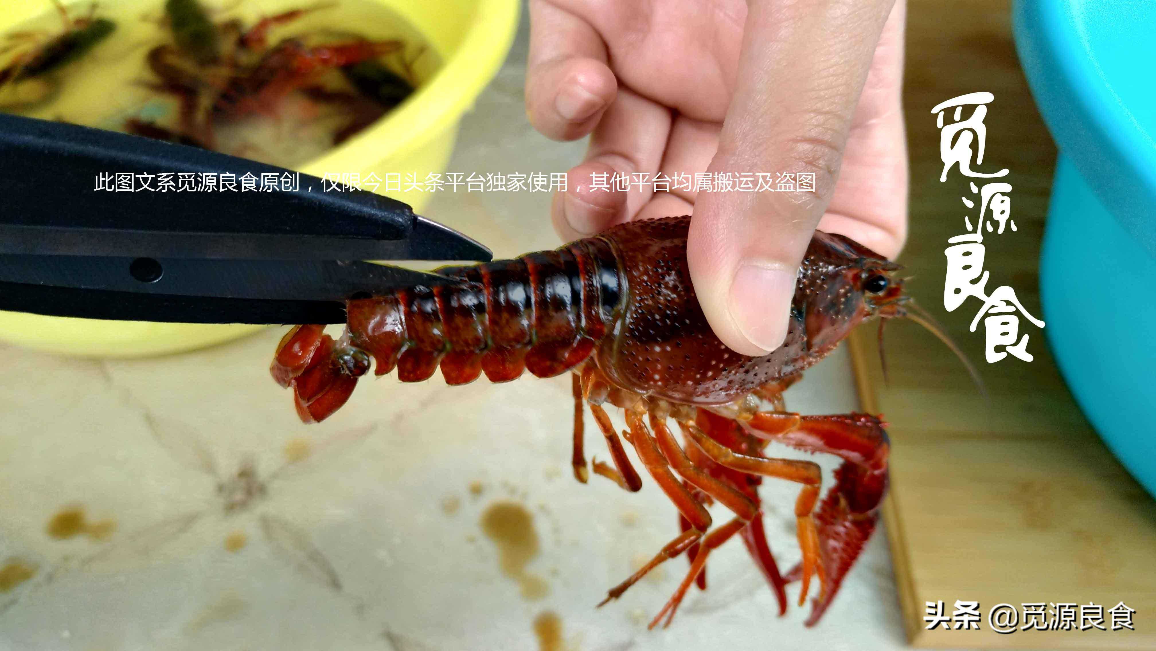 3、扯掉虾肠之后,小龙虾几乎就奄奄一息,为了在烧制的过程中,更加容易入味,我们用剪刀在虾背上剪个长长的口子,到这里小龙虾就处理完了,我们可以按照上述的步骤,逐一将小龙虾进行处理;