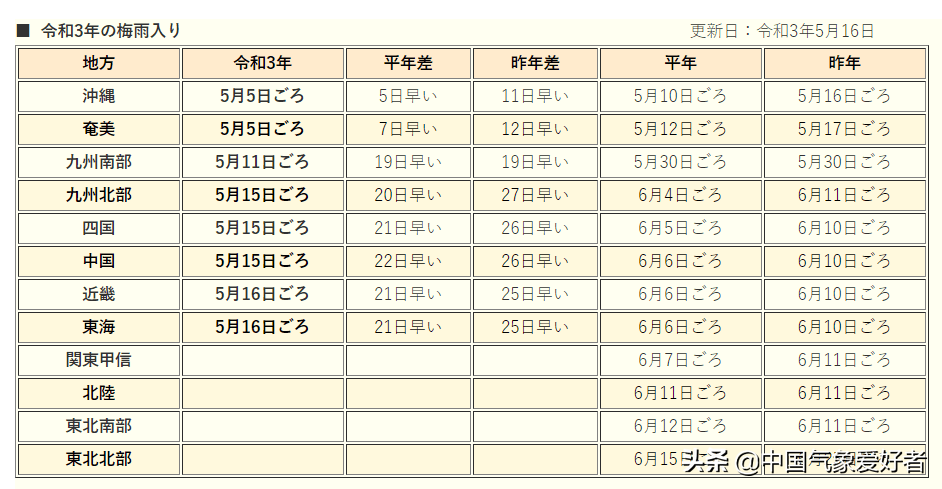 根据日本气象厅的监测数据,这是继日本九州北部、四国、中国地方等地(日本的中国地方是指日本本州岛西部的山阳道、山阴道地区,包含鸟取县、岛根县、冈山县、广岛县、山口县等5个县)进入梅雨天气后,近畿、东海进入到梅雨季节,近畿和东海比往年早了21天,非常少见。