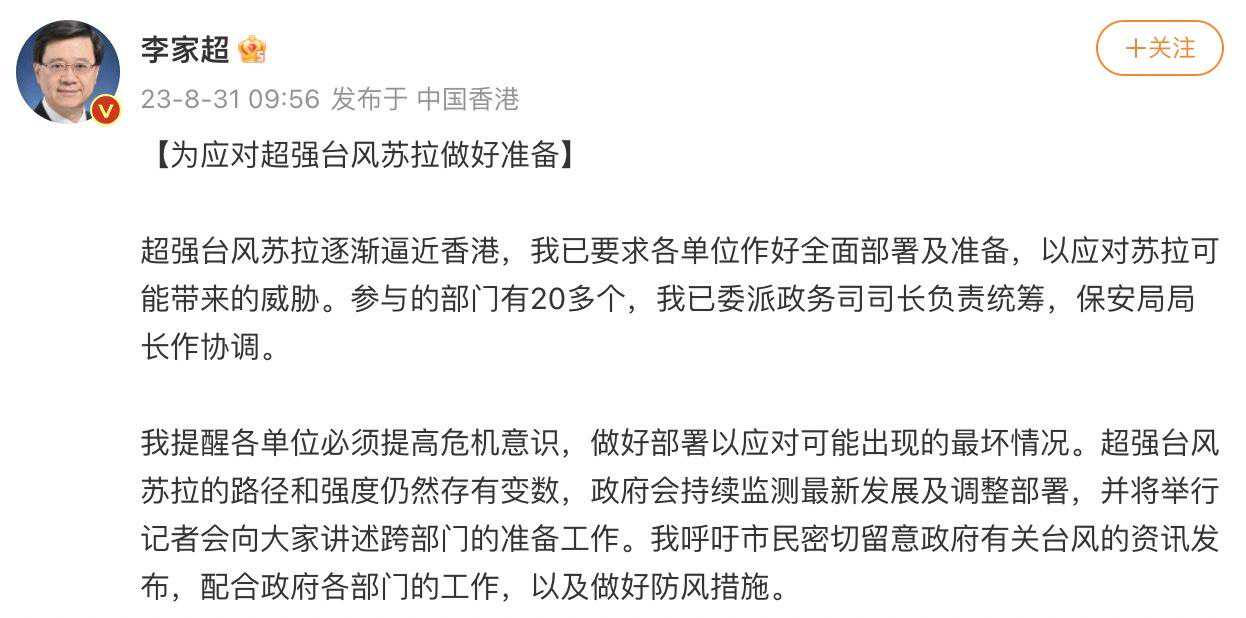 李家超今日在社交平台发文表示,为应对超强台风“苏拉”做好准备
