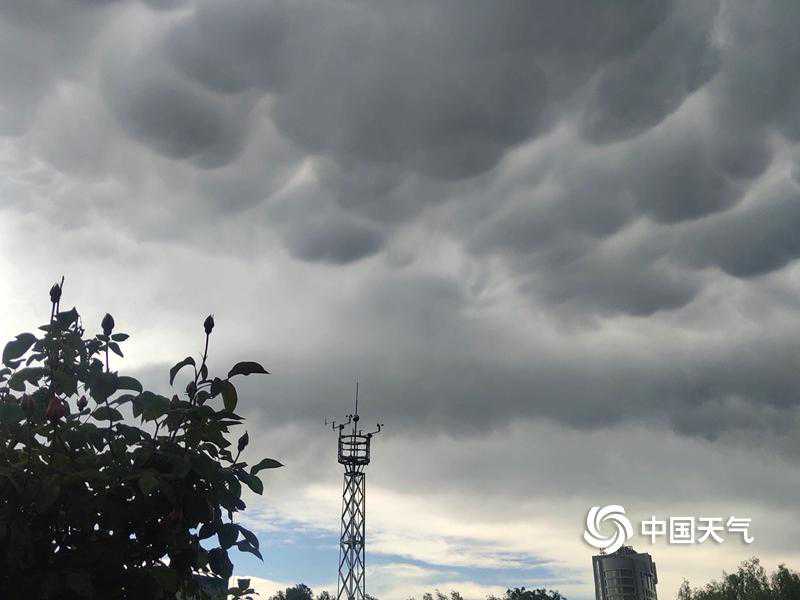 5月29日午后,甘肃省华亭市突遇强对流天气,对流发展旺盛,城区上空惊现“乳状云”奇观。乳状云又称乳状积云,在强对流发展旺盛时,下沉气流中温度较冷的空气与上升气流中温度较暖的空气相遇,易形成如同一个个袋子形状的云。(文/刘小金图/候子兴)