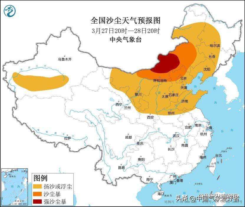 中央气象台3月27日18时继续发布沙尘暴黄色预警:受冷空气大风影响,预计3月27日20时至28日20时,新疆南疆盆地、内蒙古、宁夏、陕西中北部、山西、河北、北京、天津、山东、河南中北部、黑龙江西部、吉林中西部、辽宁等地的部分地区有扬沙或浮尘天气,其中,内蒙古中部、河北西北部、北京西北部等地的部分地区有沙尘暴,内蒙古中部局地有强沙尘暴。