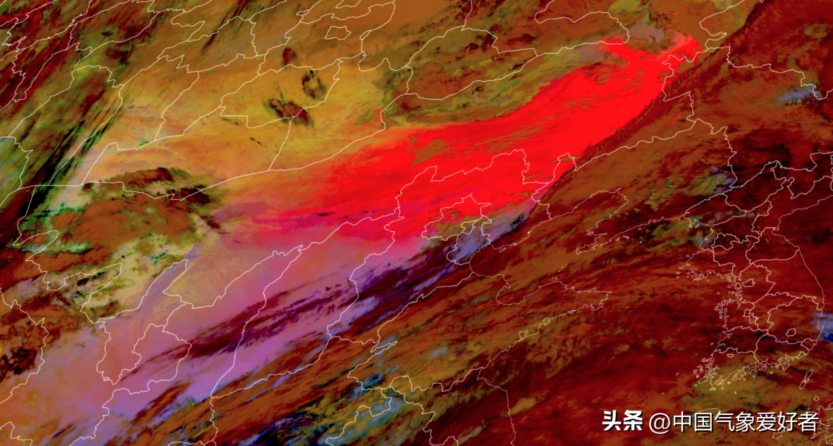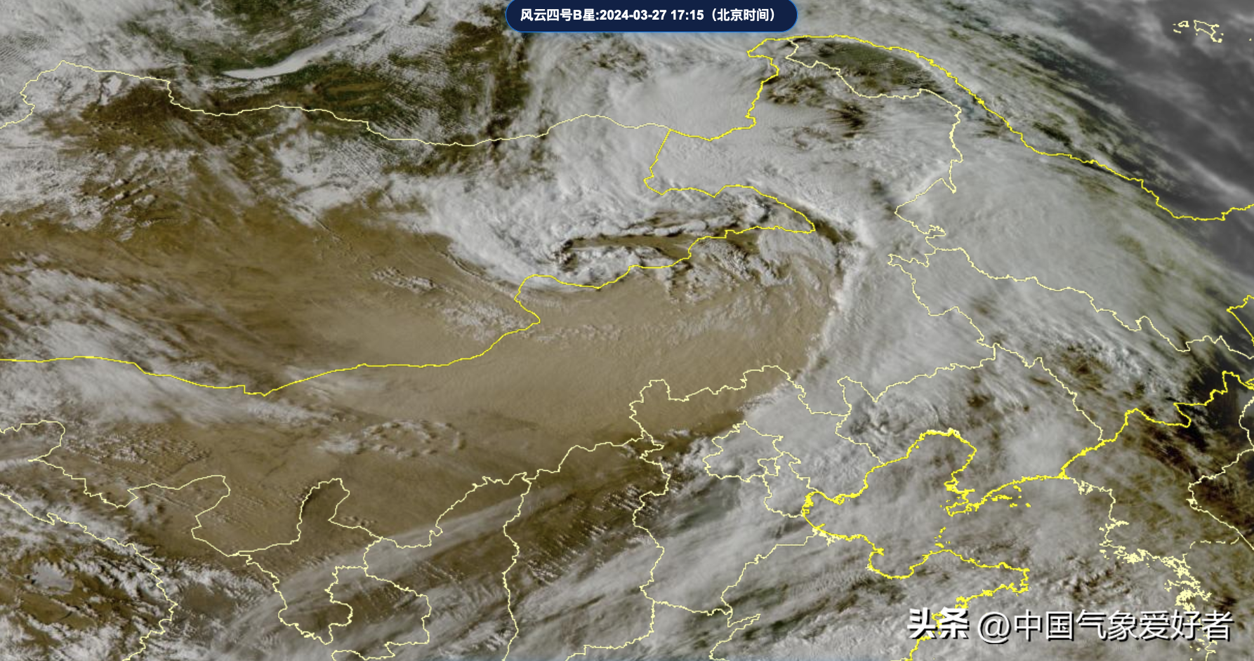 在这场大自然的狂欢中,冷暖气团在蒙古高原上空激烈碰撞,仿佛是天空中的两位舞者,在无声的交锋中引发了一场沙尘的风暴。3月27日傍晚,卫星云图上可见,巨大的螺旋形云系出现在我国北方,这正是冷暖气团追尾形成的温带气旋,因为在蒙古国形成所以称其为蒙古气旋。