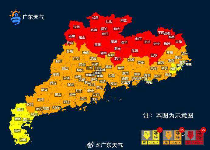 其中寒冷红色预警信号27个主要集中在粤北市县、