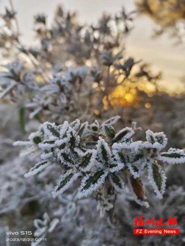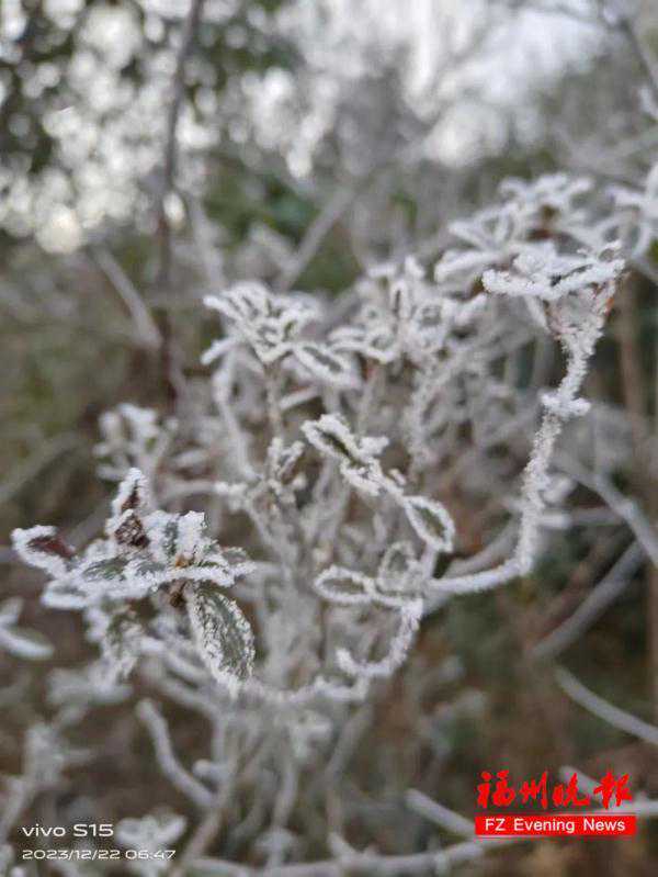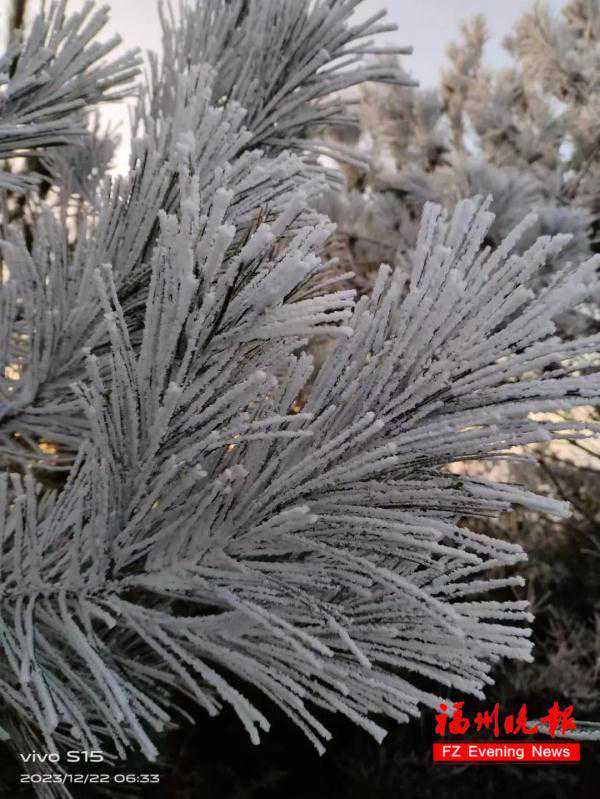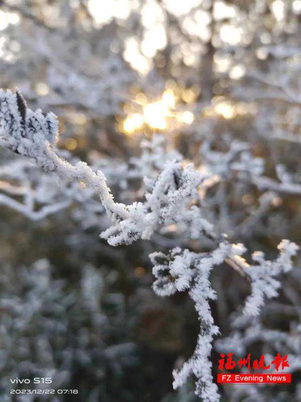 冬至日,闽侯大湖乡迎来了2023年的第一场雾凇。凌晨5点多,闽侯大湖乡岭头村党支部书记朱必孔便迫不及待地驱车前往村里的后门山,一览这片雪白的盛景。