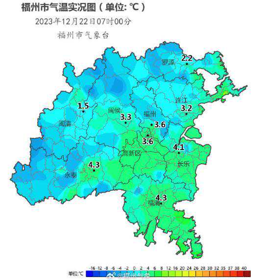 据@福州气象消息,受寒潮级冷空气的影响,今天(22日,周五,冬至节气)早晨福州全市气温较低,全市城区内最低温在1℃~4℃左右,以闽清1.3℃为最低,福州主城区最低温在3.5℃。福州今天7时气温3.6℃,较昨日降低4.3℃。
