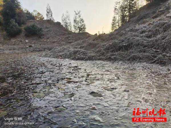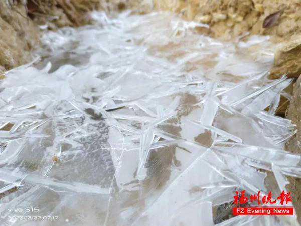 今天上午7点40分,大湖乡岭头村的温度达到-4℃,山上的水面上还结成一片薄薄的冰层。