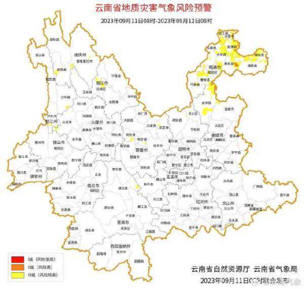 2023年09月11日08:00~09月12日08:00,昭通市彝良县、镇雄县,曲靖市会泽县发生滑坡泥石流的风险高;昭通市大部,曲靖市西北部,楚雄州北部、中部,迪庆州东部、南部,丽江市中部,怒江州南部,大理州西部,普洱市东北部发生滑坡泥石流的风险较高。