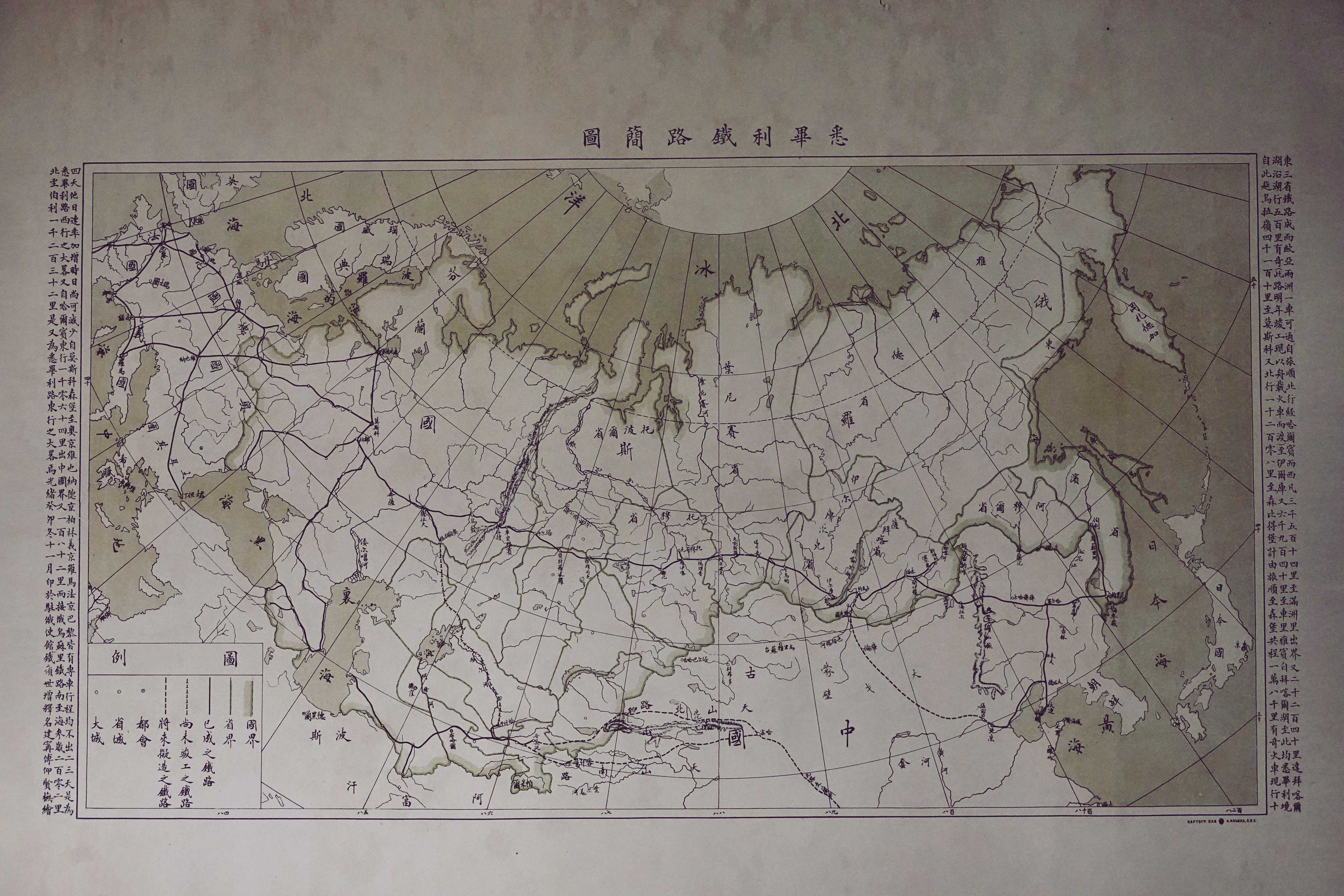 在这张地图的两侧,各有三纵列的文字,密密麻麻地印在上面。让人头疼的是,竟无一标点。要破解它,必须学会断句。而断句的先决,要对“悉毕利铁路”的历史有个大致了解。别被“悉毕利铁路”高深莫测的名字吓到了,它其实就是西伯利亚铁路的一种译名。