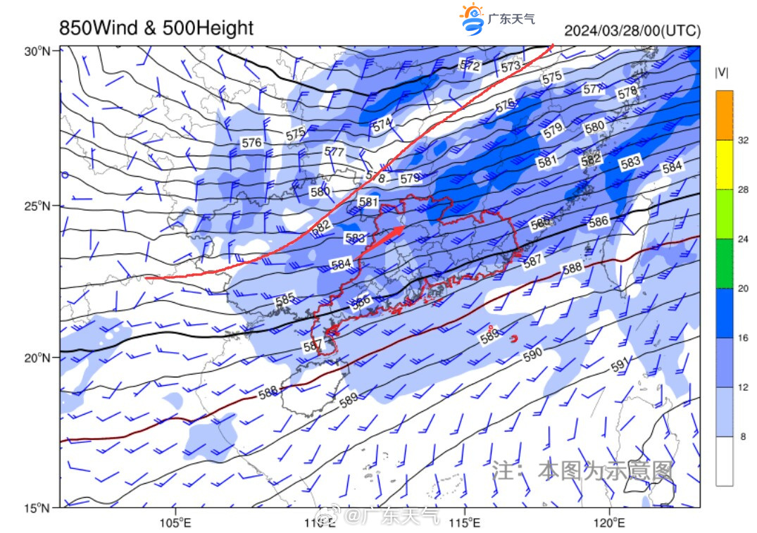 28日—29日,有切变线靠近粤北,500hpa处于槽前,中北部有雨势逐渐明显,其余多云间阴天,有短时小雨。