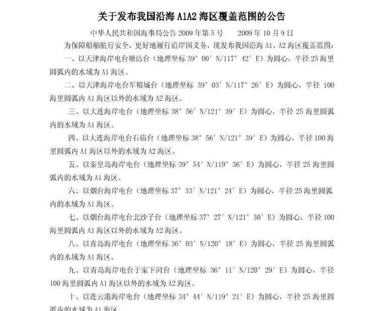 下图为2009年中国海事局发布的“关于发布我国沿海A1A2海区覆盖范围的公告”,从中可以看出,因为电台的位置、覆盖的半径,所以会形成上图我国A1、A2、A3海区示意图所示的分布区域。