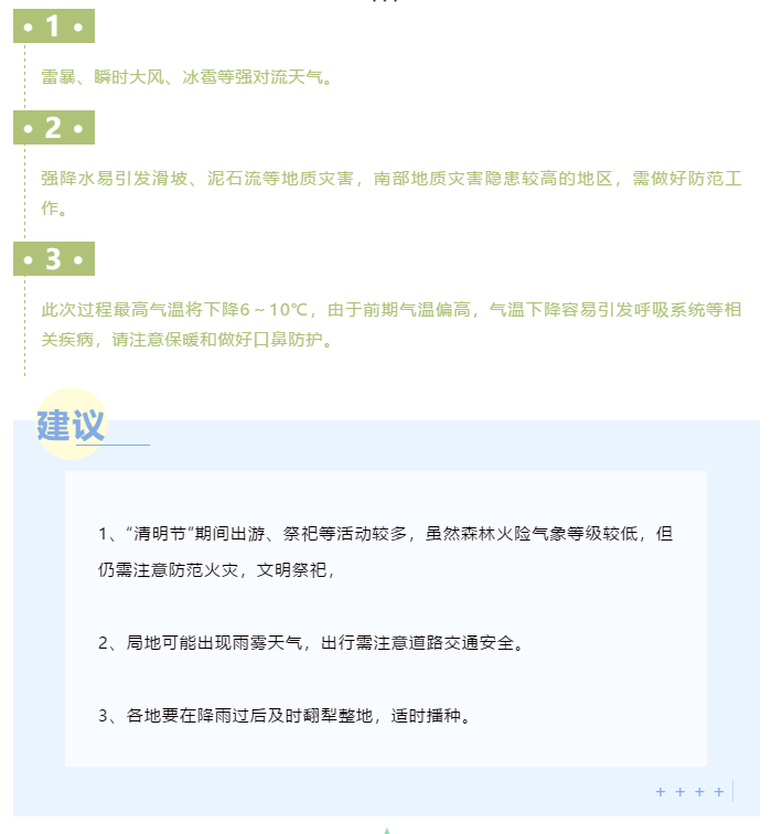 4月4日:阴有小雨局部中雨,部分地区伴有雷暴、大风、冰雹等强对流天气。