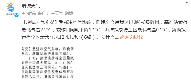 受强冷空气影响,昨晚至今晨我区出现4-6级阵风,基准站录得最低气温2.2℃,较昨日同期下降1.1℃;派潭镇录得全区最低气温0.1℃,新塘镇录得全区最大阵风12.4米/秒(6级)。