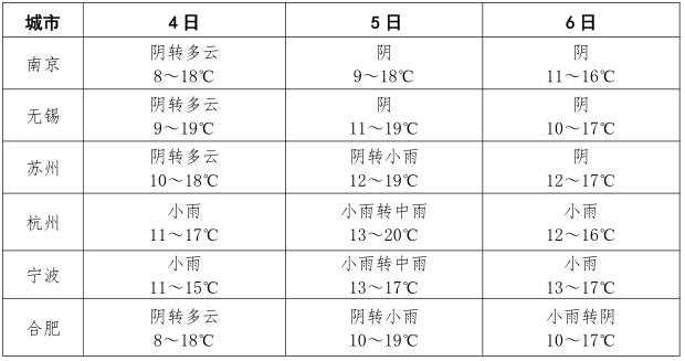 受高空槽东移影响,清明假日期间苏南阴到多云,偶有小雨;浙北阴有时有小雨,局部有中雨。