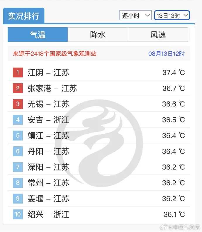 △今天12、13时全国气温排行榜,江苏均前十占八,并牢牢锁定前三名。