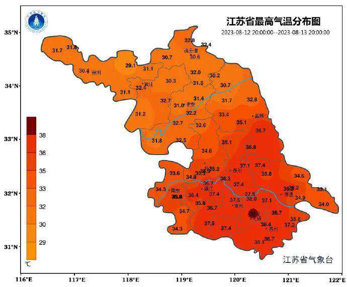 △据江苏气象,今日最高气温排行榜:无锡(38.2℃)排名第一,江阴(38℃)排在第二,靖江、常州和溧阳(37.5℃),并列第三。