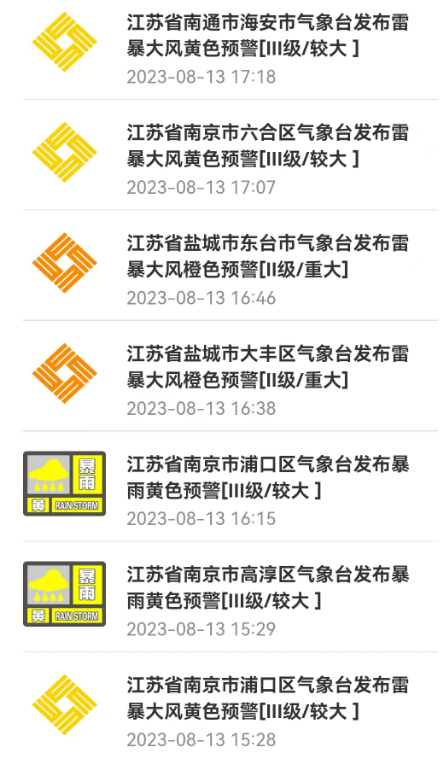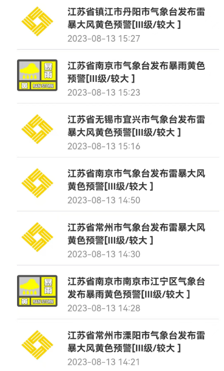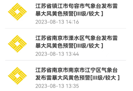 预计今天下午到上半夜,雨花台、玄武、秦淮、建邺、鼓楼、江北新区、栖霞等区的部分街道将出现雷电,并可能伴有7到9级雷暴大风及短时强降水等强对流天气。江宁及溧水等区已发布雷暴大风黄色预警信号。请注意防范。