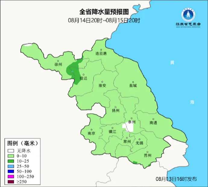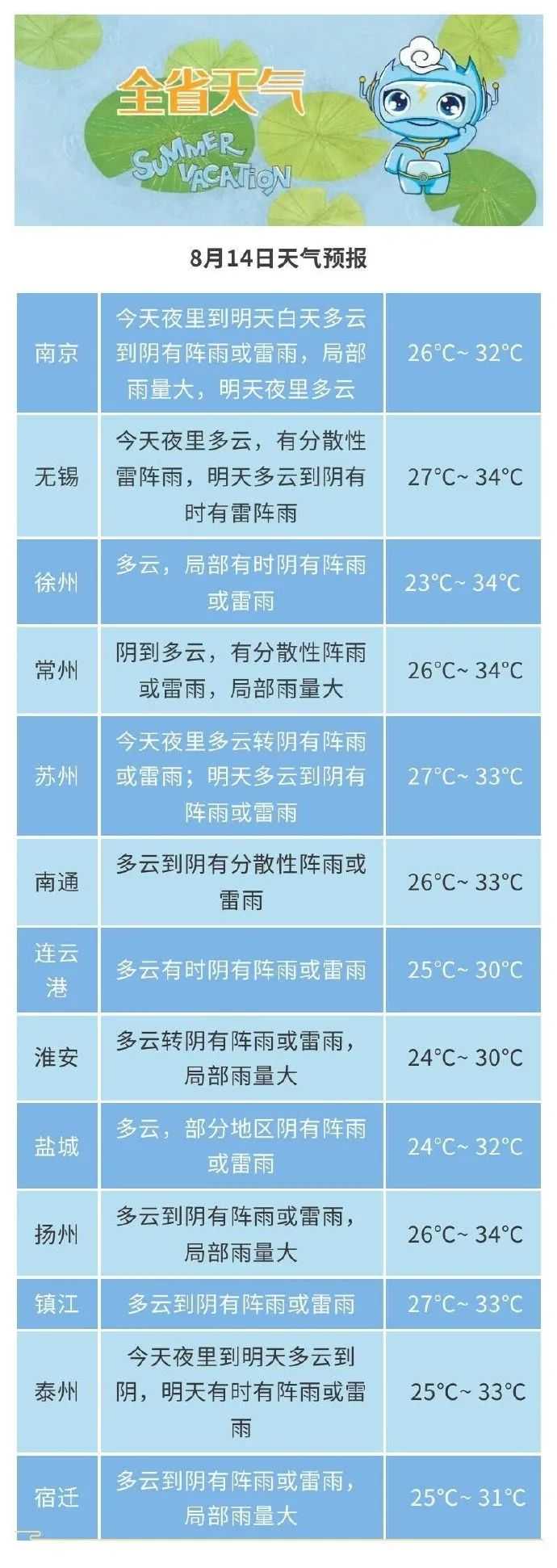 最高温度:淮河以南地区32℃左右,其他地区30~31℃;最低温度:沿江和苏南地区25~26℃,其他地区23~24℃。全省偏东风3-4级。
