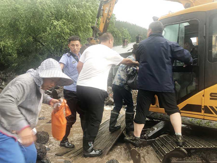 在穆棱林业局河南泵房处,民警发现由于雨势过大,此处发生泥石流,大量土块泥水冲进城镇路面,导致居民被困、道路阻断。民警立即找来木板,搭建了一条简易通道,站在泥水中搀扶群众脱困,并陆续将23名受困群众转移至安全地带。