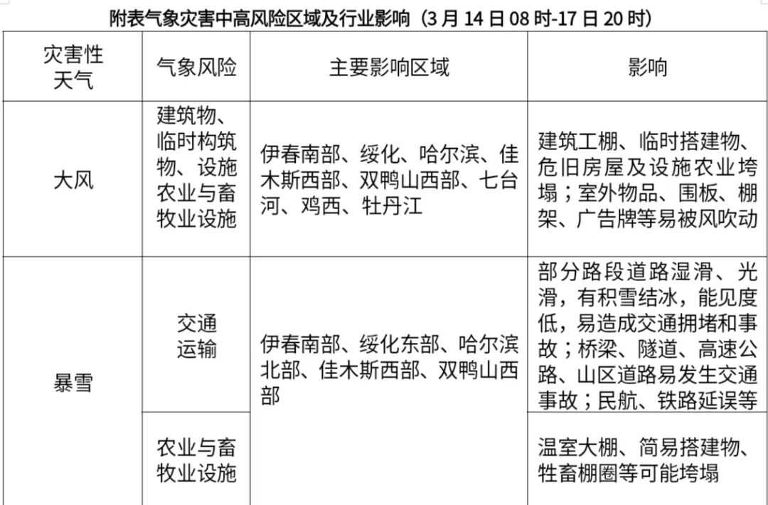 14日-15日北部地区有小到中雪,黑河东部、伊春北部、鹤岗、佳木斯西部、双鸭山西部局地大雪;16日-17日南部地区有中到大雪,伊春南部、绥化东部、哈尔滨北部、佳木斯西部、双鸭山西部局地暴雪。16日白天齐齐哈尔南部、大庆、绥化南部、哈尔滨南部部分时段有雨或雨夹雪。降雪前后气温变化幅度较大,14日-17日南部地区有6级~7级阵风,东南部局地阵风可达8级。