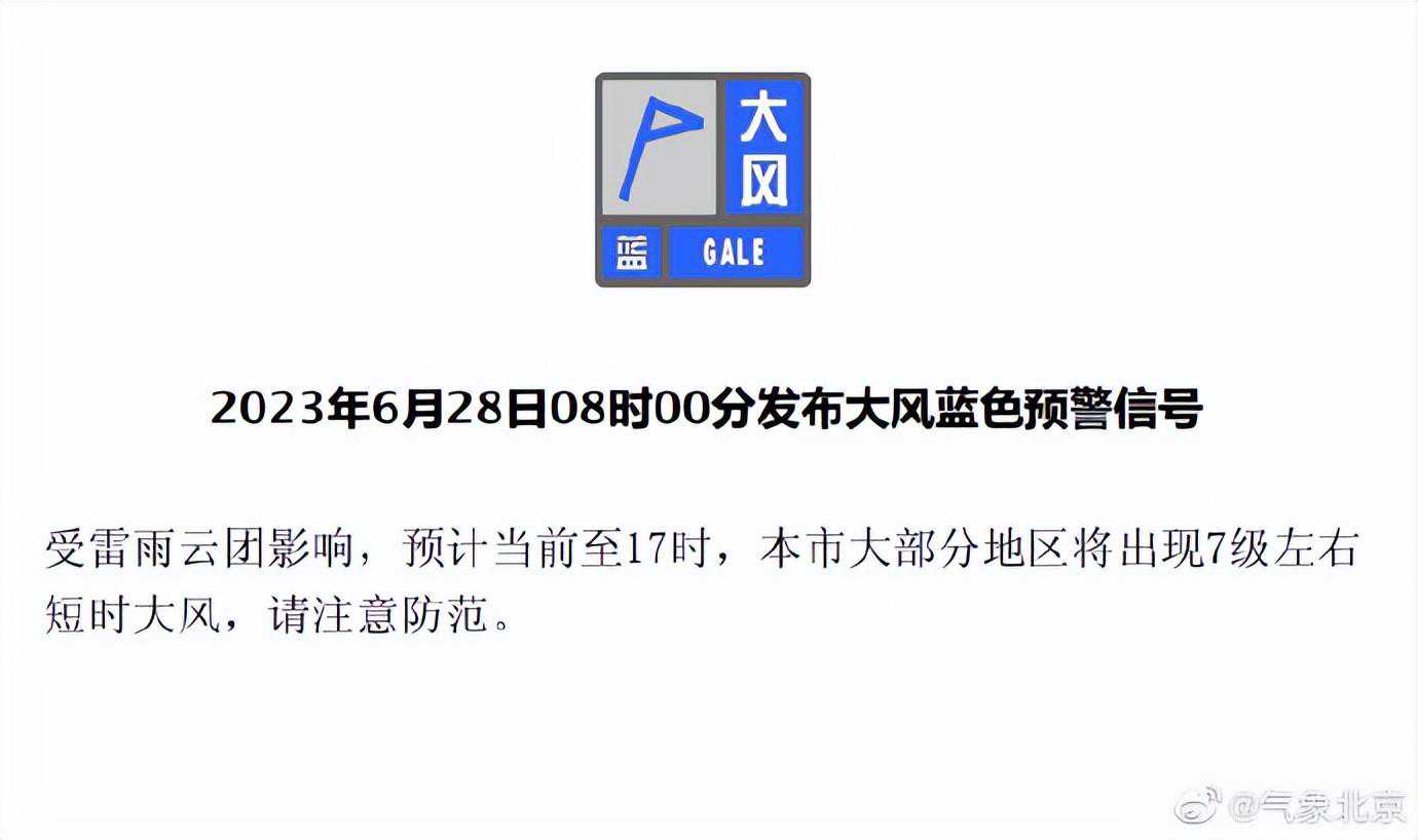 据北京市气象局网站消息,预计,28日7时至17时,北京市大部分地区自西向东将出现雷阵雨天气,局地短时雨强较大,并伴有7级左右短时大风和冰雹。