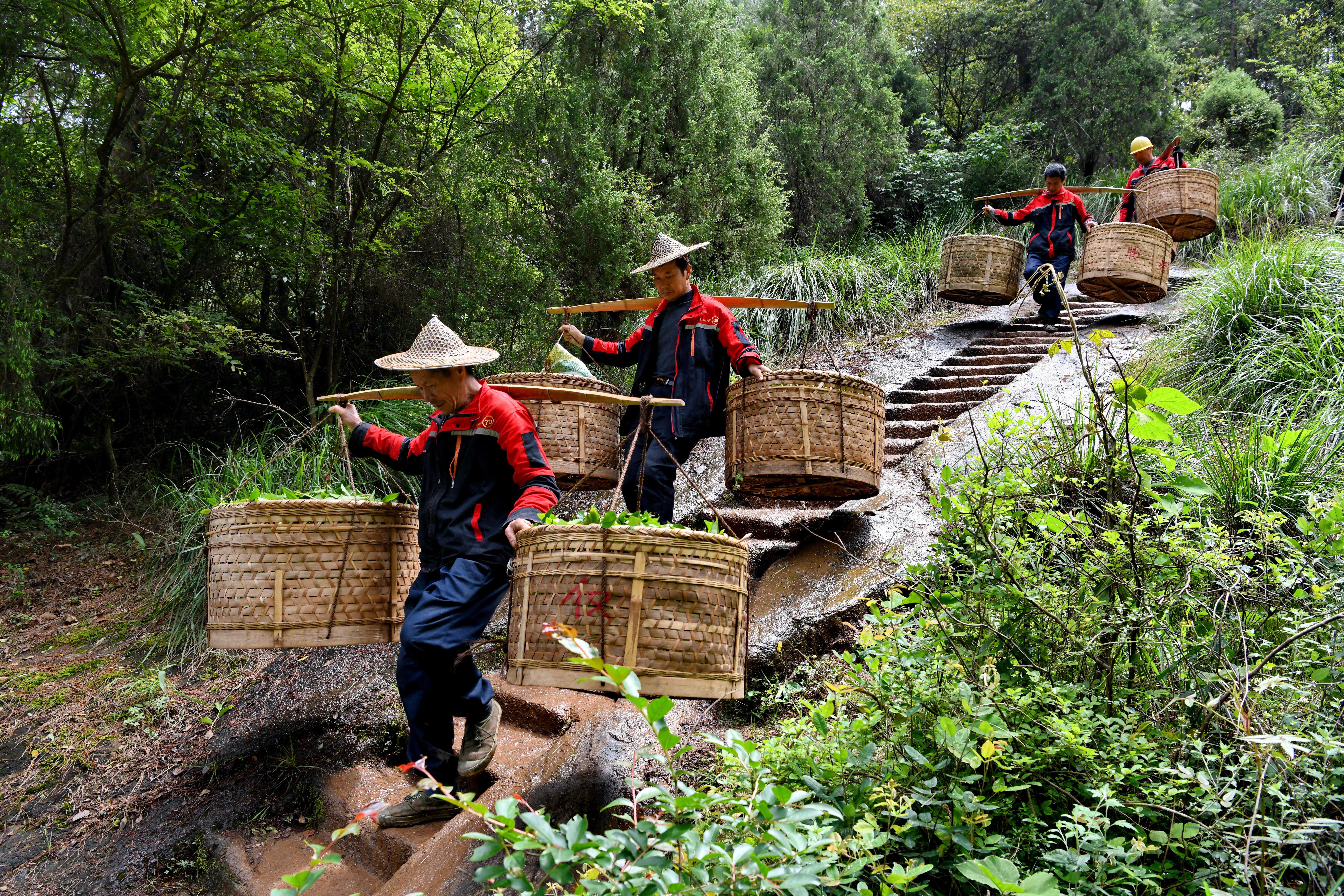 5月2日,福建省武夷山市茶农将茶青挑下山。新华社发(陈颖摄)