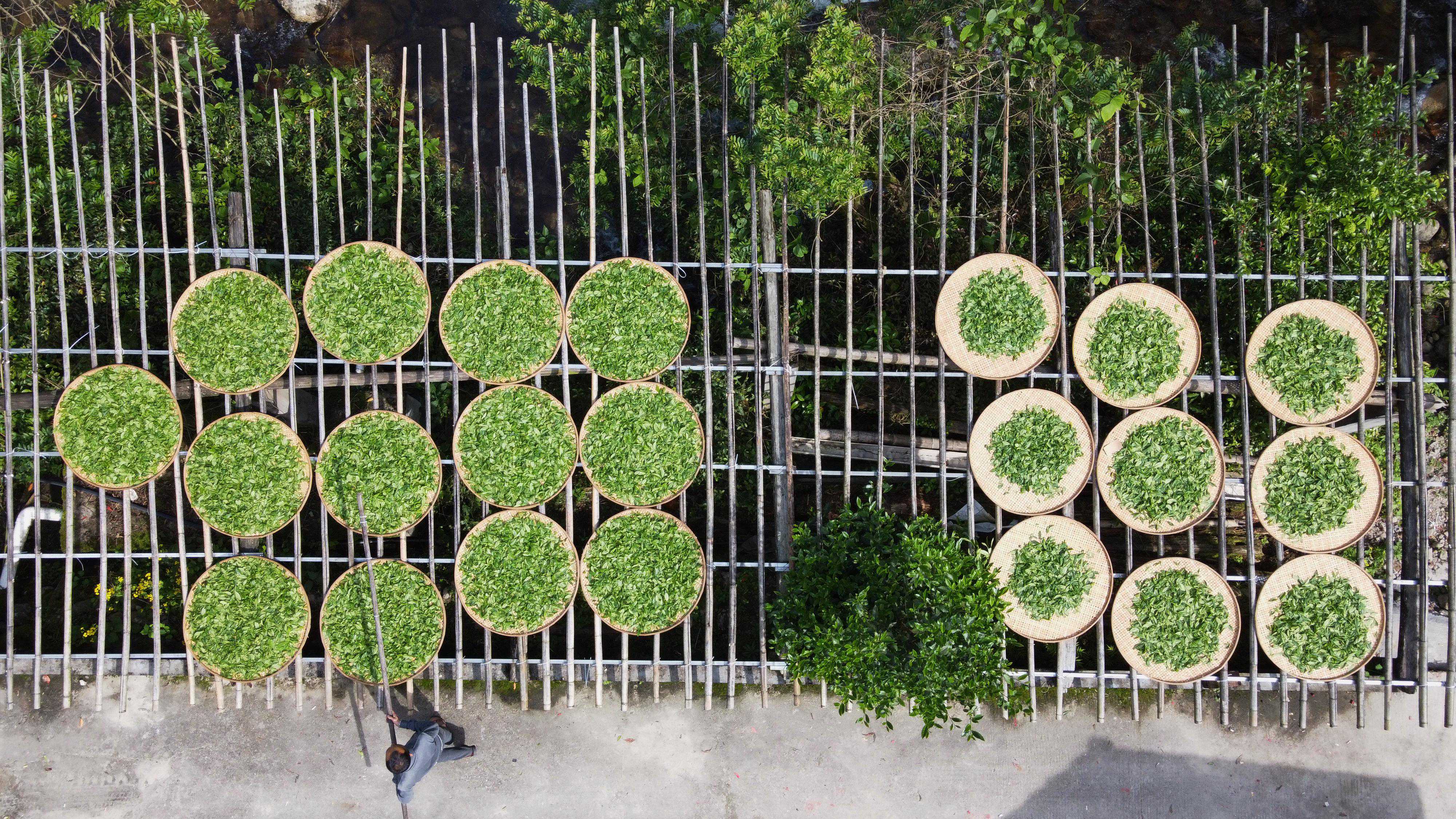 5月2日,福建省武夷山市星村镇溪源村茶农在茶坊前晾晒茶青(无人机照片)。新华社发(陈颖摄)