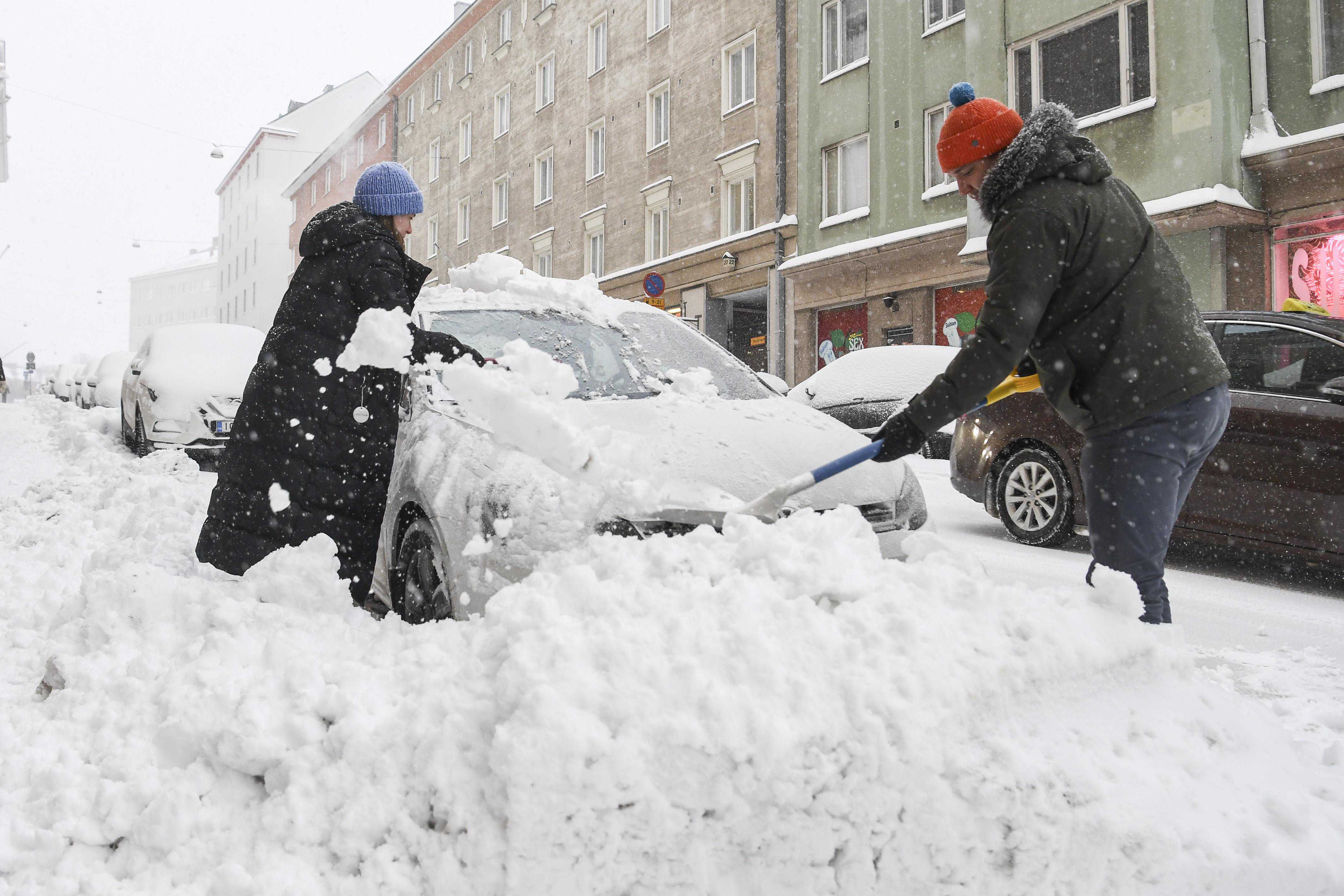 新华社照片,外代,2021年1月13日(外代二线)(4)赫尔辛基降雪1月12日,在芬兰赫尔辛基,人们清除汽车上的积雪。芬兰南部和西南地区近日遭遇暴雪天气。新华社/欧新