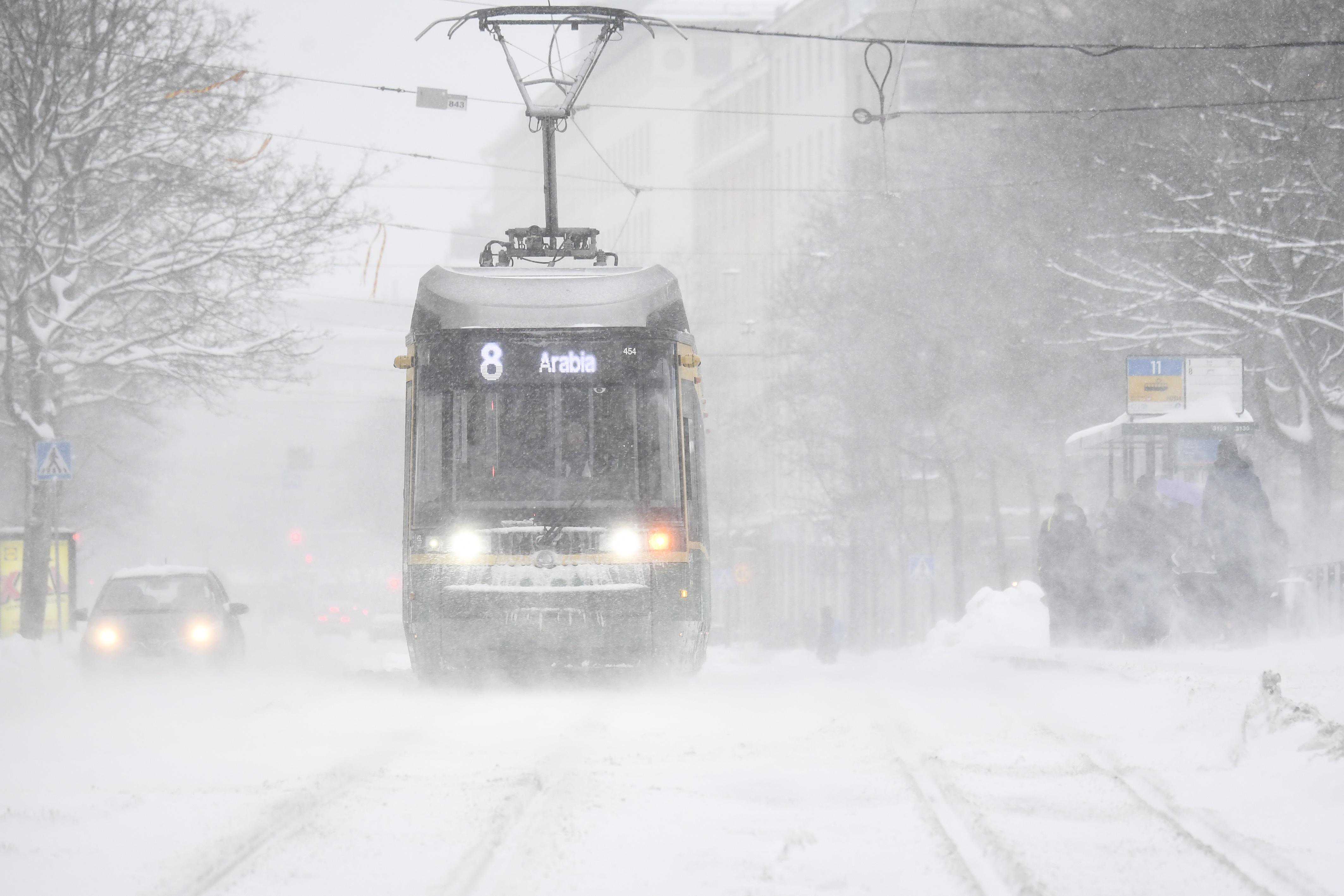 新华社照片,外代,2021年1月13日(外代二线)(1)赫尔辛基降雪1月12日,在芬兰赫尔辛基,一辆电车冒雪行驶。芬兰南部和西南地区近日遭遇暴雪天气。新华社/欧新
