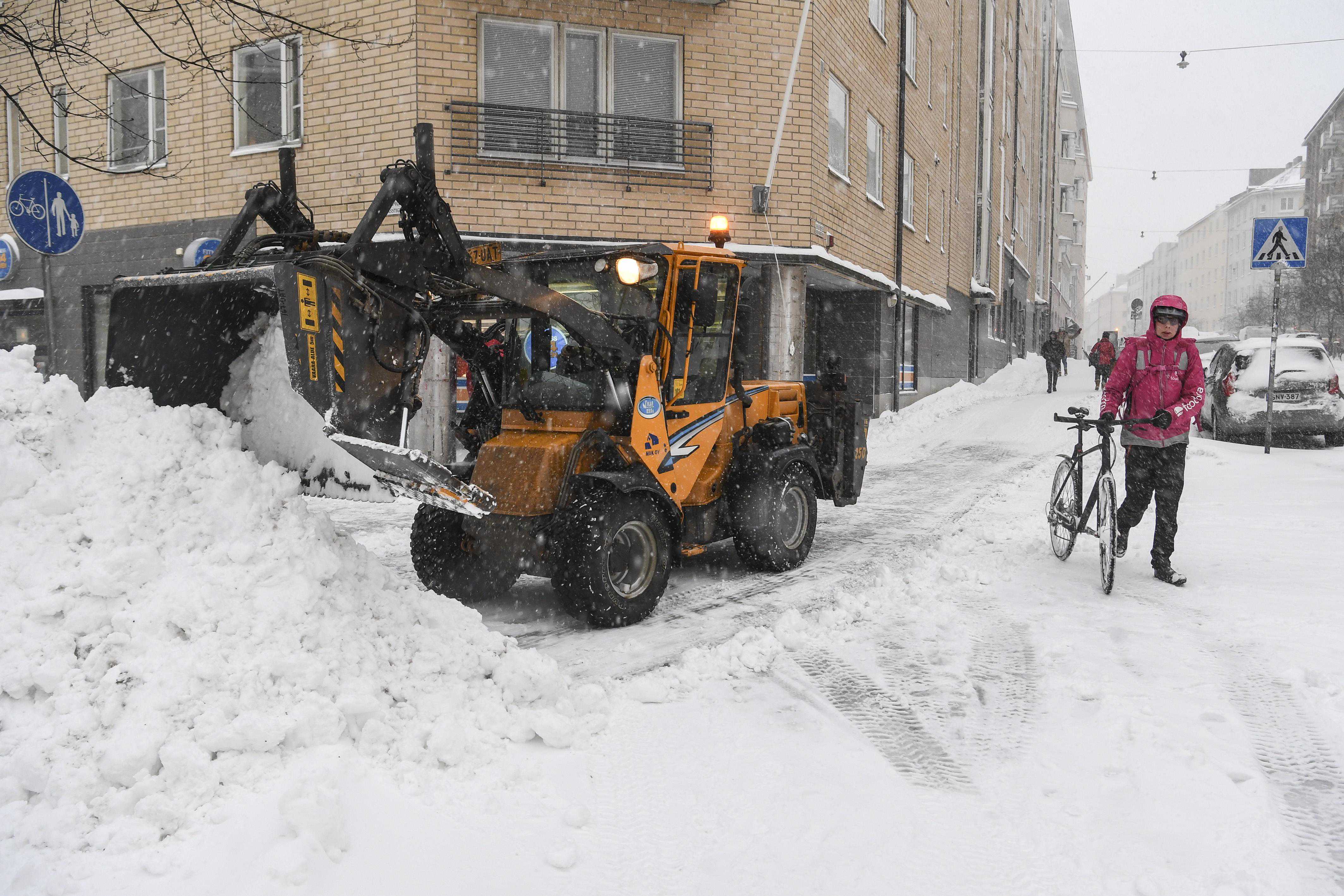 新华社照片,外代,2021年1月13日(外代二线)(8)赫尔辛基降雪1月12日,一辆挖掘机在芬兰赫尔辛基清除路面上的积雪。芬兰南部和西南地区近日遭遇暴雪天气。新华社/欧新