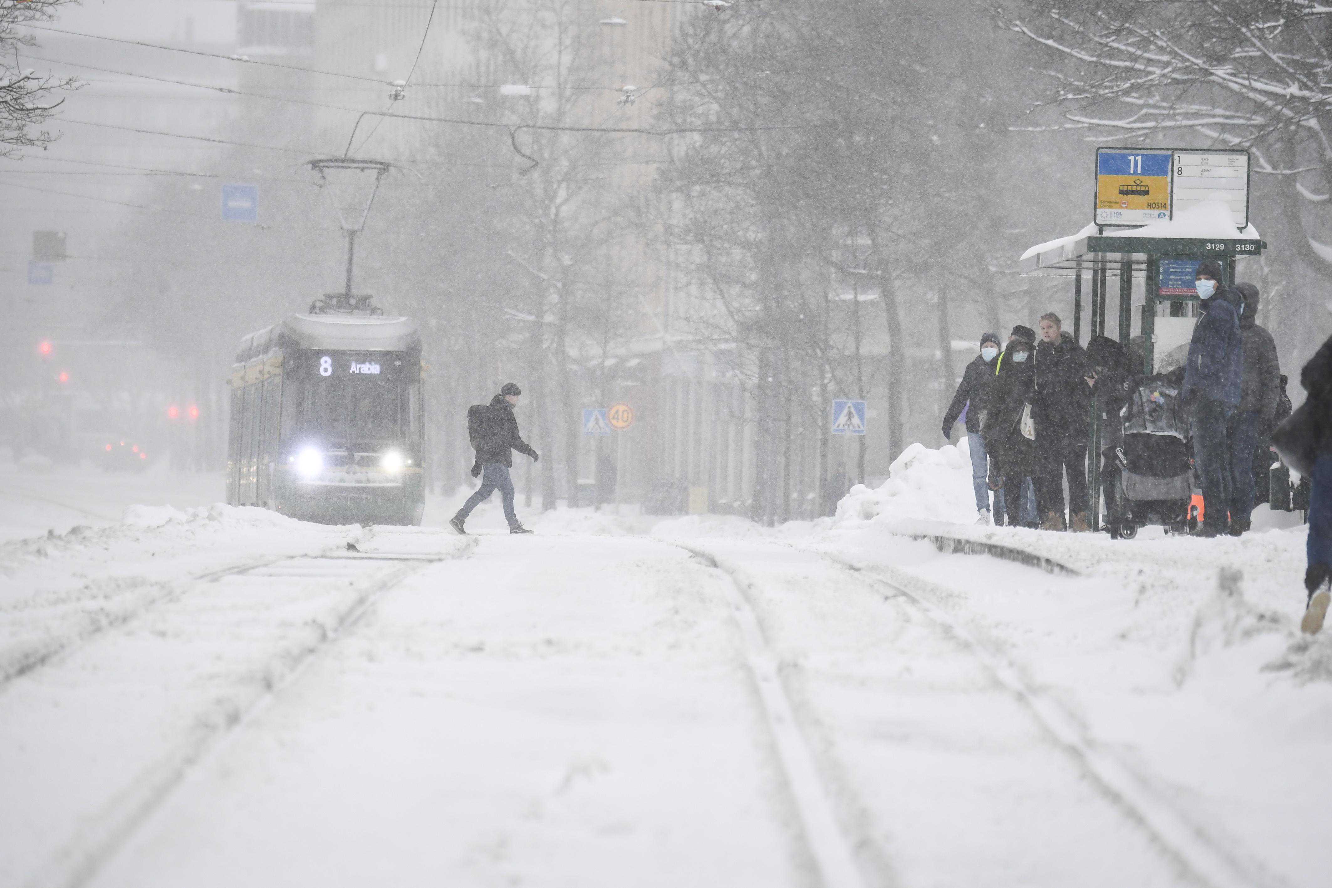 新华社照片,外代,2021年1月13日(外代二线)(5)赫尔辛基降雪1月12日,在芬兰赫尔辛基,人们冒雪出行。芬兰南部和西南地区近日遭遇暴雪天气。新华社/欧新