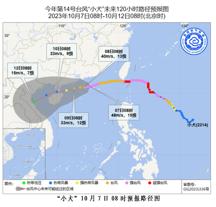根据气象预报,今年第14号台风“小犬”(强台风级),7日08时中心位于北纬21.1度、东经115.5度,也就是在距离广东省汕尾市偏南方向约190公里的南海北部海面上,中心附近最大风力15级(48米/秒)。预计,“小犬”将以每小时5-10公里的速度向西偏南方向移动,强度维持或缓慢减弱,逐渐向海南岛东部到广东西部一带沿海靠近。受“小犬”影响,9日夜间起,海南岛大部地区有阵雨或雷阵雨天气,局地大到暴雨。琼州海峡,本岛乐东、东方到万宁一带海面,风力逐渐增大到9-10级,阵风11-12级。