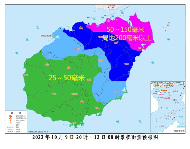 海南省气象台预计,9日20时—12日08时各地累积雨量:海口、文昌、临高、澄迈、定安、屯昌、琼海、万宁、琼中和儋州等市县50—150毫米、局地200毫米以上,其余市县25—50毫米。