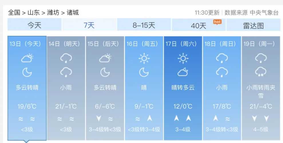 15日夜间到16日白天,天气多云转晴,南风4~5级,最低气温-4℃,最高气温9℃。