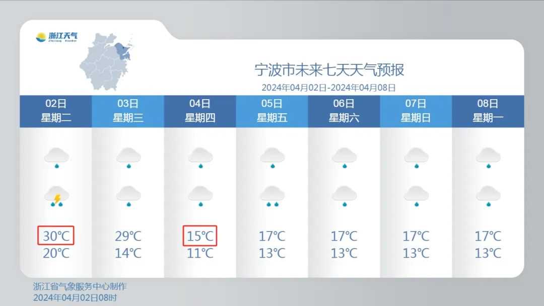 4月4日:浙中南地区阴有阵雨或雷雨,部分中到大雨;浙北地区阴有阵雨。