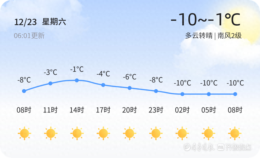 今天是12月23日,星期六,农历十一月十一。多云转晴,南风2级。