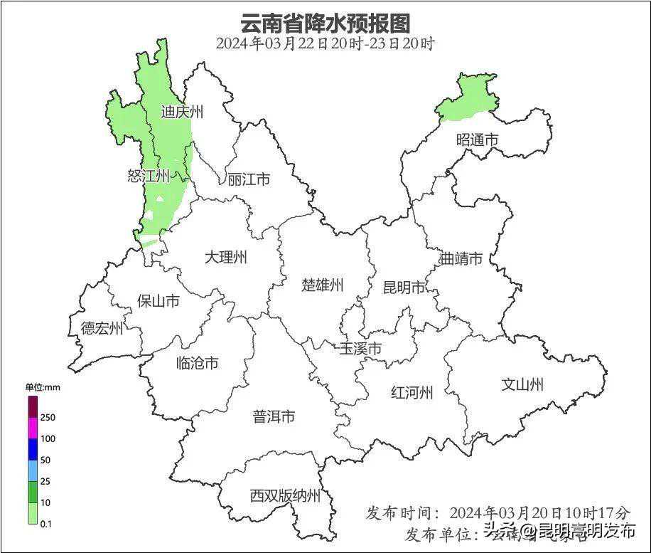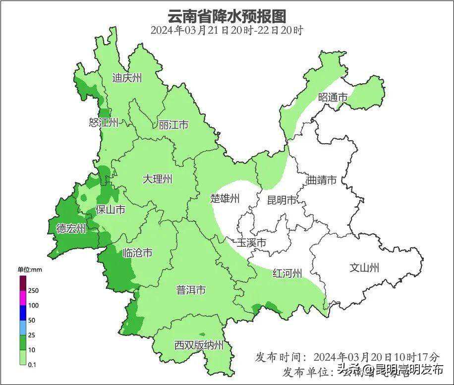 预计3月20日20时-3月21日20时:丽江市、大理州、保山市、德宏州、临沧市、普洱市、西双版纳州、楚雄州、昆明市、玉溪市、昭通市南部、曲靖市、红河州中部和北部、文山州北部3级,其他地区1~2级。
