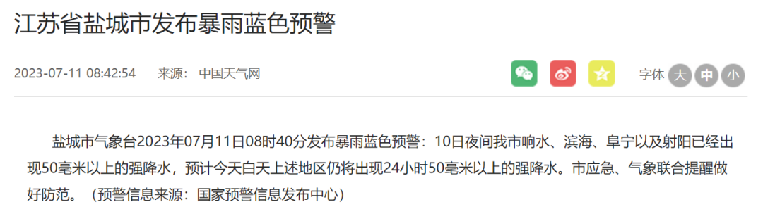 预计今天中午至夜里,我市亭湖、盐都、盐南高新区、经济开发区等地区的部分乡镇(街道)将出现雷电活动,并伴有8—10级雷暴大风、1小时50毫米以上的短时强降水等强对流天气。市应急、气象联合提醒做好防范。