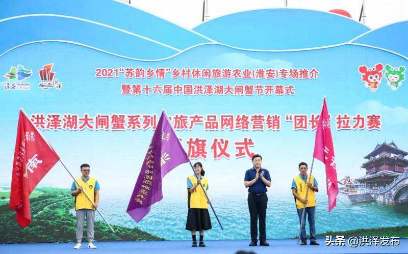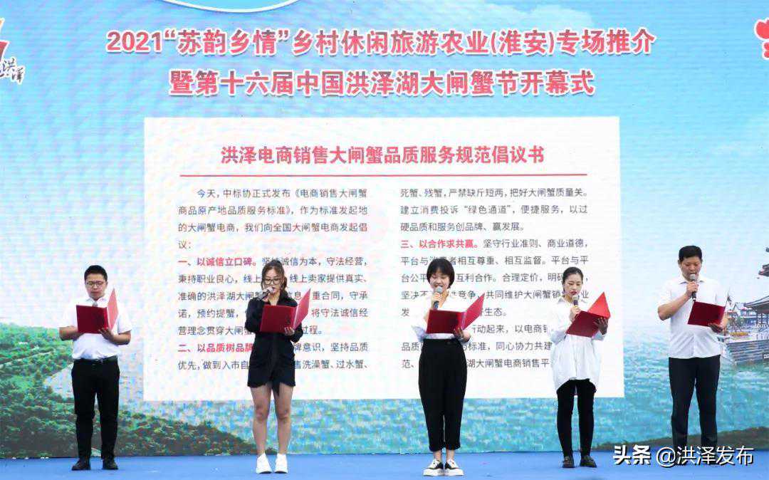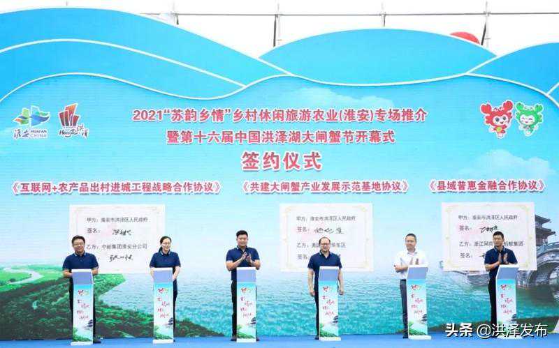 开幕式上,张灏为洪泽湖大闸蟹系列农旅产品网络营销“团长”拉力赛代表授旗;赵临斌发布《大闸蟹商品原产地品质服务电商销售标准》;洪泽电商代表宣读《洪泽电商销售大闸蟹品质服务规范倡议》;区政府与美团、浙江网商银行、中邮集团淮安分公司分别签署《共建大闸蟹产业发展示范基地协议》《县域普惠金融合作协议》《互联网+农产品出村进城工程战略合作协议》;播放了“苏韵乡情”农旅区域公用品牌形象设计征集活动宣传片。