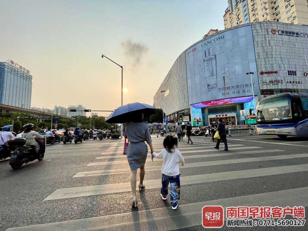 3月29日,南宁市气温首次突破了30℃,民族大道上,市民撑伞遮阳。南国早报客户端记者邹财麟摄