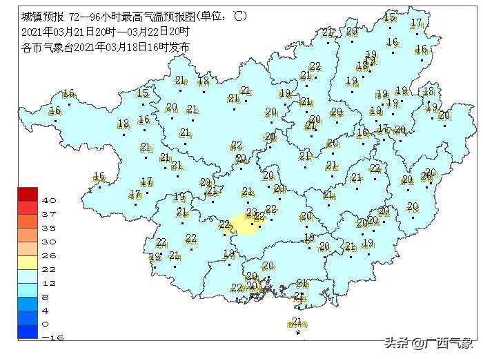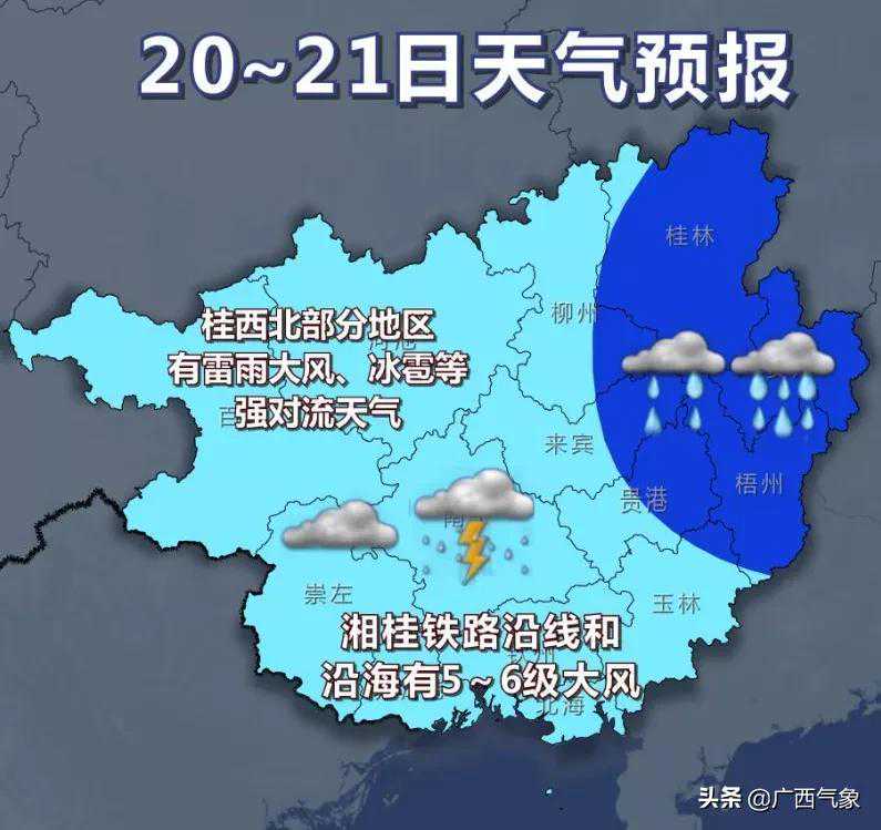 20-21日,受冷空气影响全区阴天转阵雨或雷雨,其中桂东部分地区有中到大雨;桂西北部分地区有雷雨大风、冰雹等强对流天气。